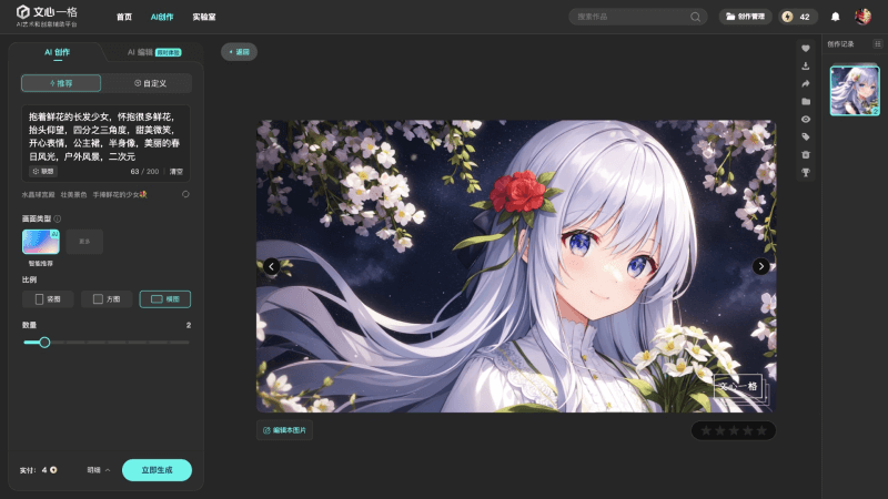 文心一格是由百度推出的依托其文心大模型和飞桨技术的文本生成图片的 AI 艺术和创意辅助平台,于2022年8月正式发布。作为国内第一梯队的AI图片生成的工具和平台,文心一格可以进行国风、油画、水彩、水粉、动漫、写实等十余种不同风格高清画作的生成。